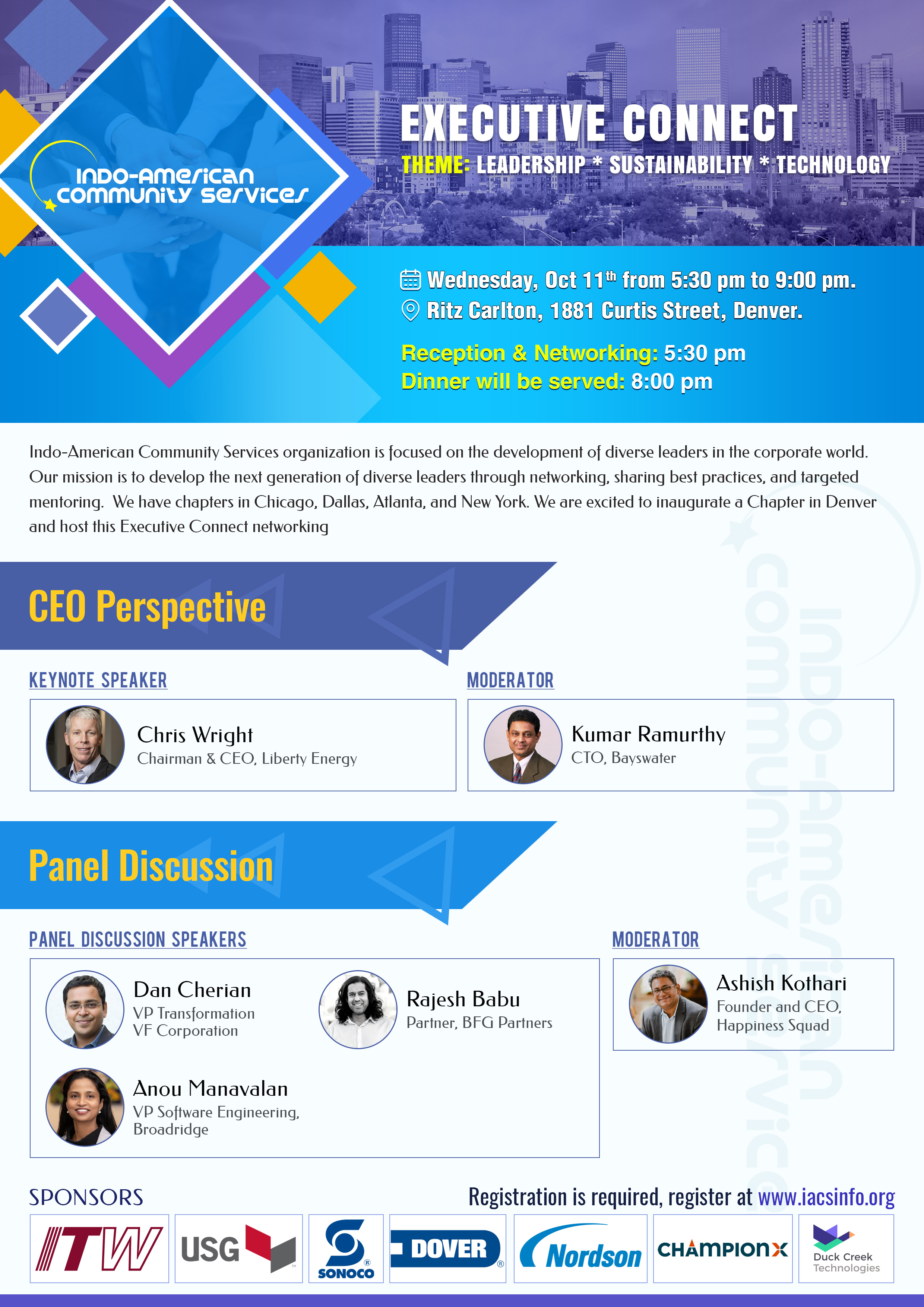 Indo-American Community Services organization is focused on the development of diverse leaders in the corporate world. Our mission is to develop the next generation of diverse leaders through networking, sharing best practices, and targeted mentoring. We have chapters in Chicago, Dallas, Atlanta, and New York. We are excited to inaugurate a Chapter in Denver and host this Executive Connect networking event.