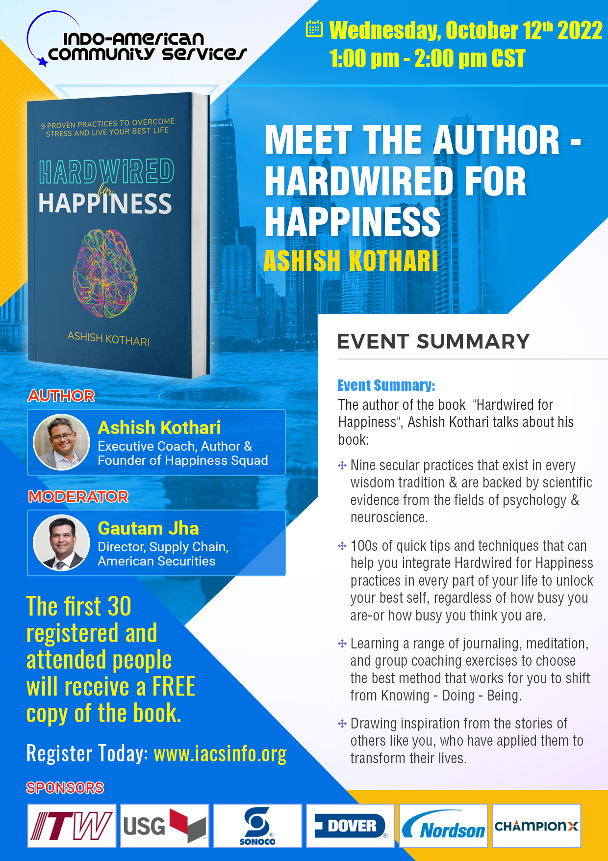 The first 30 registered and attended people will receive a FREE copy of the book Hardwired to Happiness