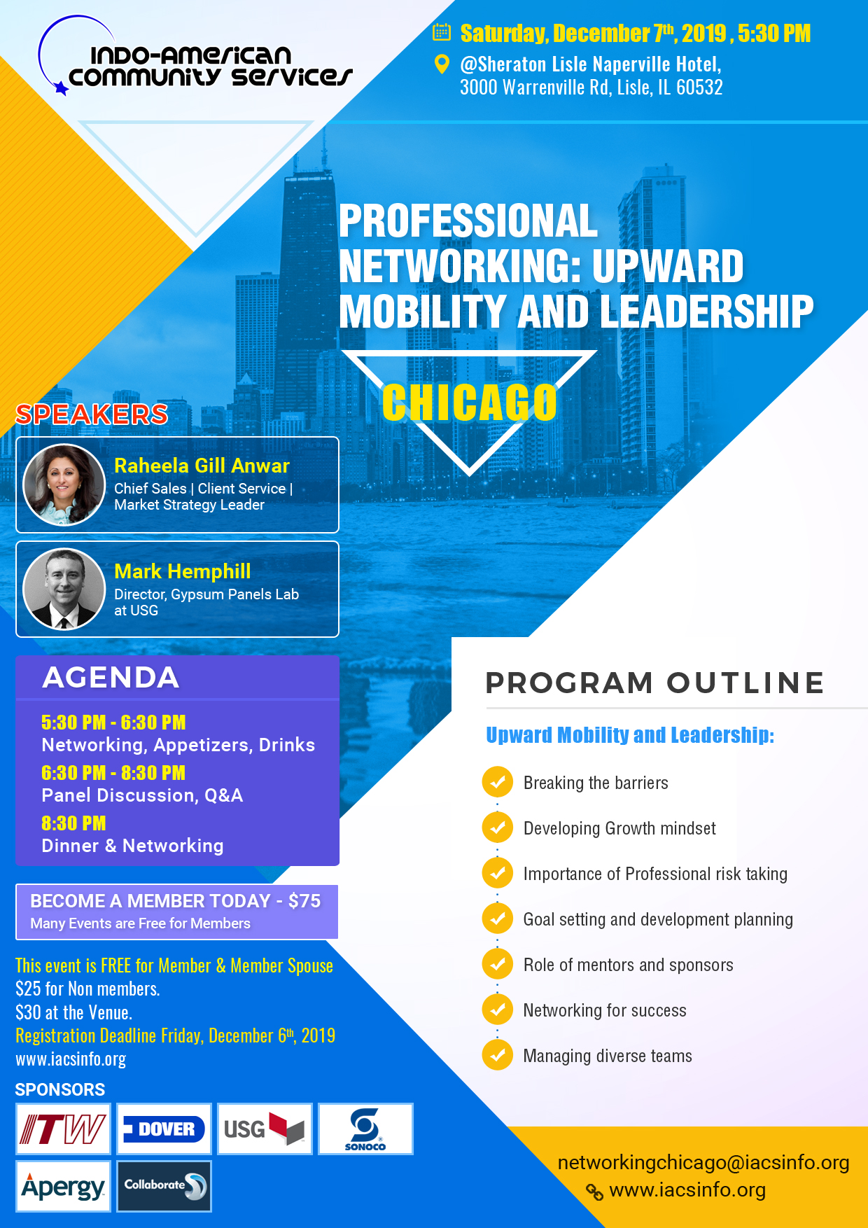 Indo American Community Services is hosting the Professional Networking Event at Lisle Naperville Sheraton Hotel on Saturday, December 7th at 5:30 pm. Theme of the Conference is Upward Mobility & Leadership.